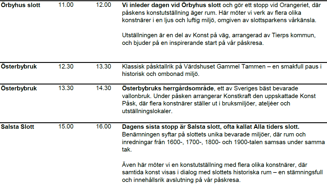 Under dagen tar vi del av konstutställningar med flera olika konstutställare på samtliga platser, promenerar i historiska miljöer och njuter av en traditionell påsktallrik i genuin värdshusmiljö.